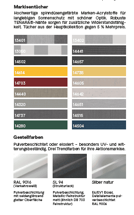 Eine große Auswahl an Gestellfarben und Markisentüchern ermöglicht eine perfekte Anpassung