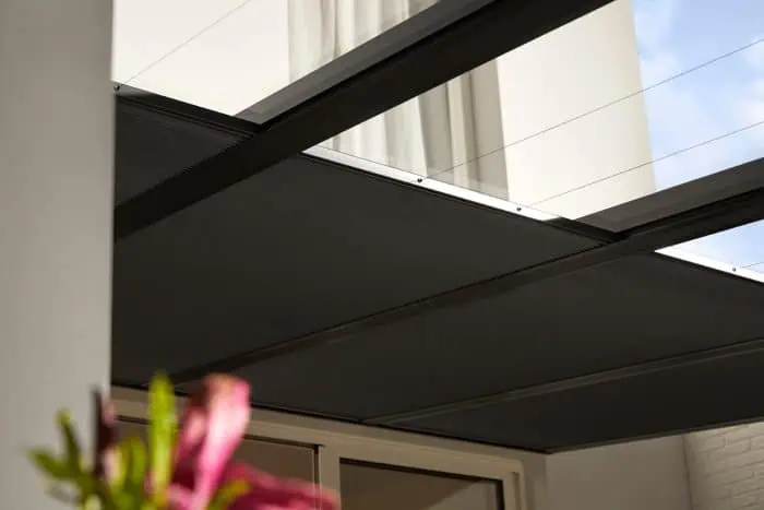 Die Stoffe sind auf der Rückseite mit einer speziellen Beschichtung versehen, die UV-beständig ist. So schützt das Produkt vor Wärme. Insgesamt sind drei Stoffe hierfür verfügbar. Das System funktioniert mittels Seilspannung und kann in zwei Richtungen bedient werden, von oben nach unten und von unten nach oben. Aufgrund des integrierten Zugbalkens kann das Produkt in jeder gewünschten Position arretiert werden.