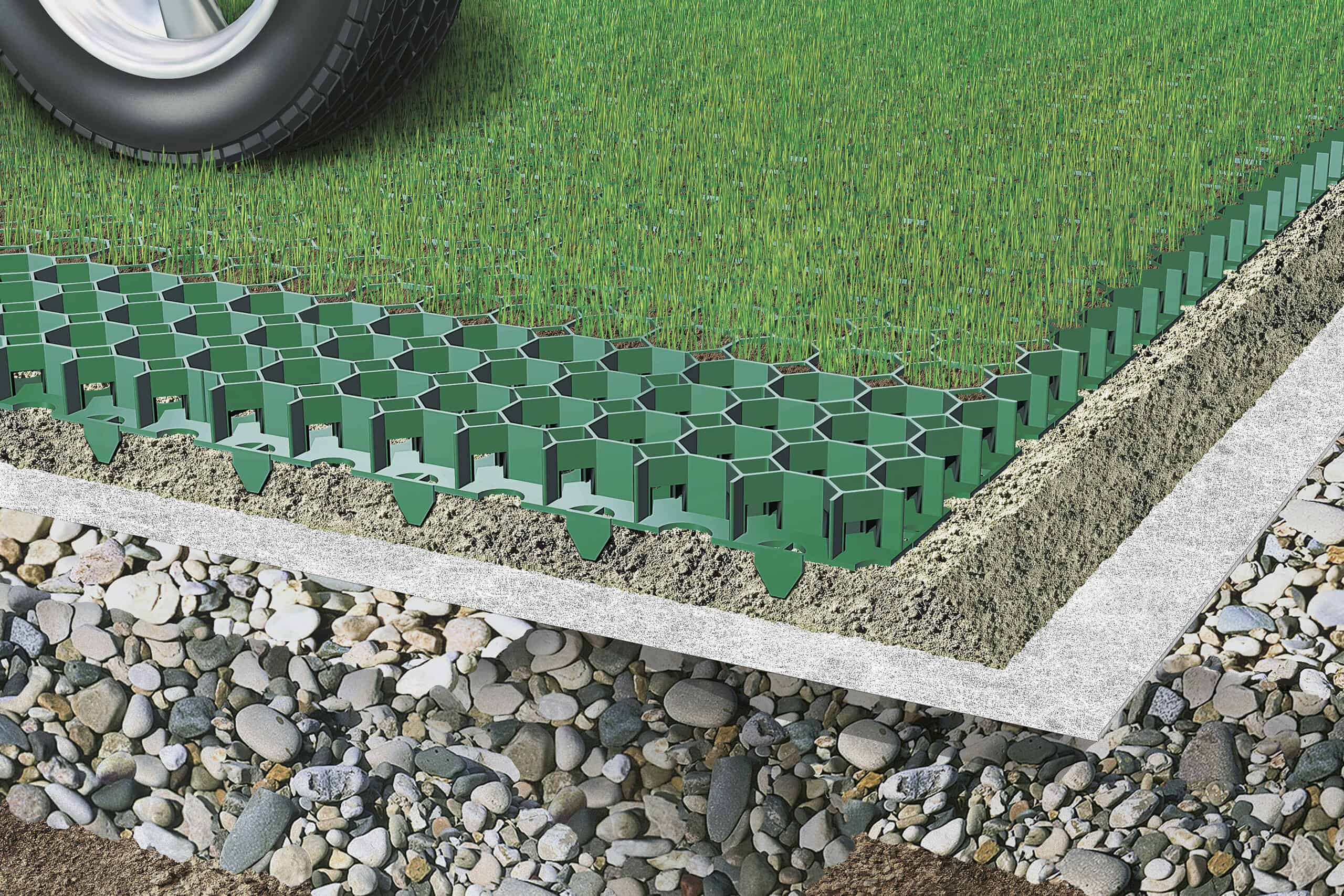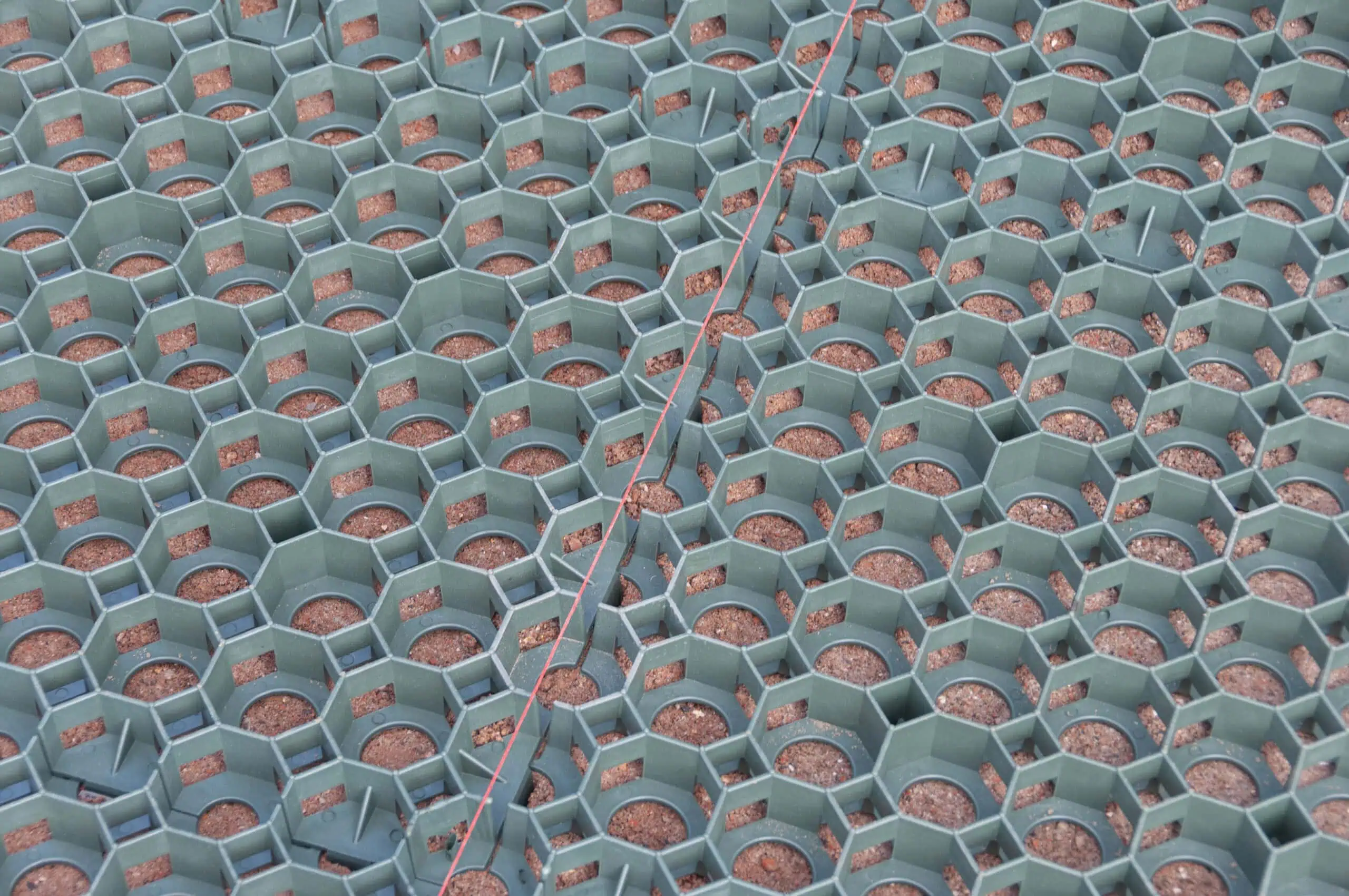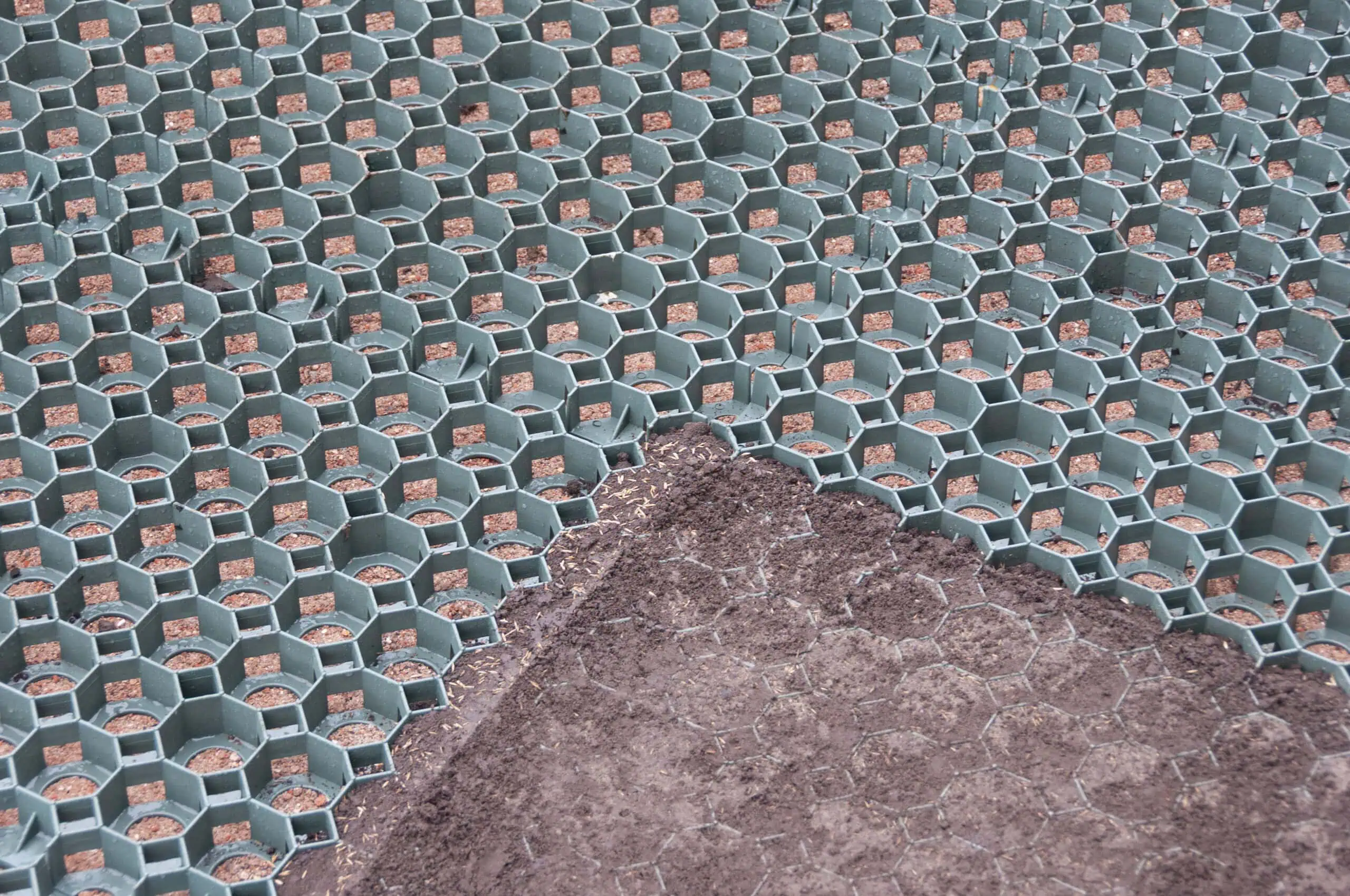 Die offene Wabenstruktur ermöglicht eine feste Verzahnung mit dem Untergrund. Nach der Begrünung werden die Stege vollständig vom Rasen