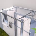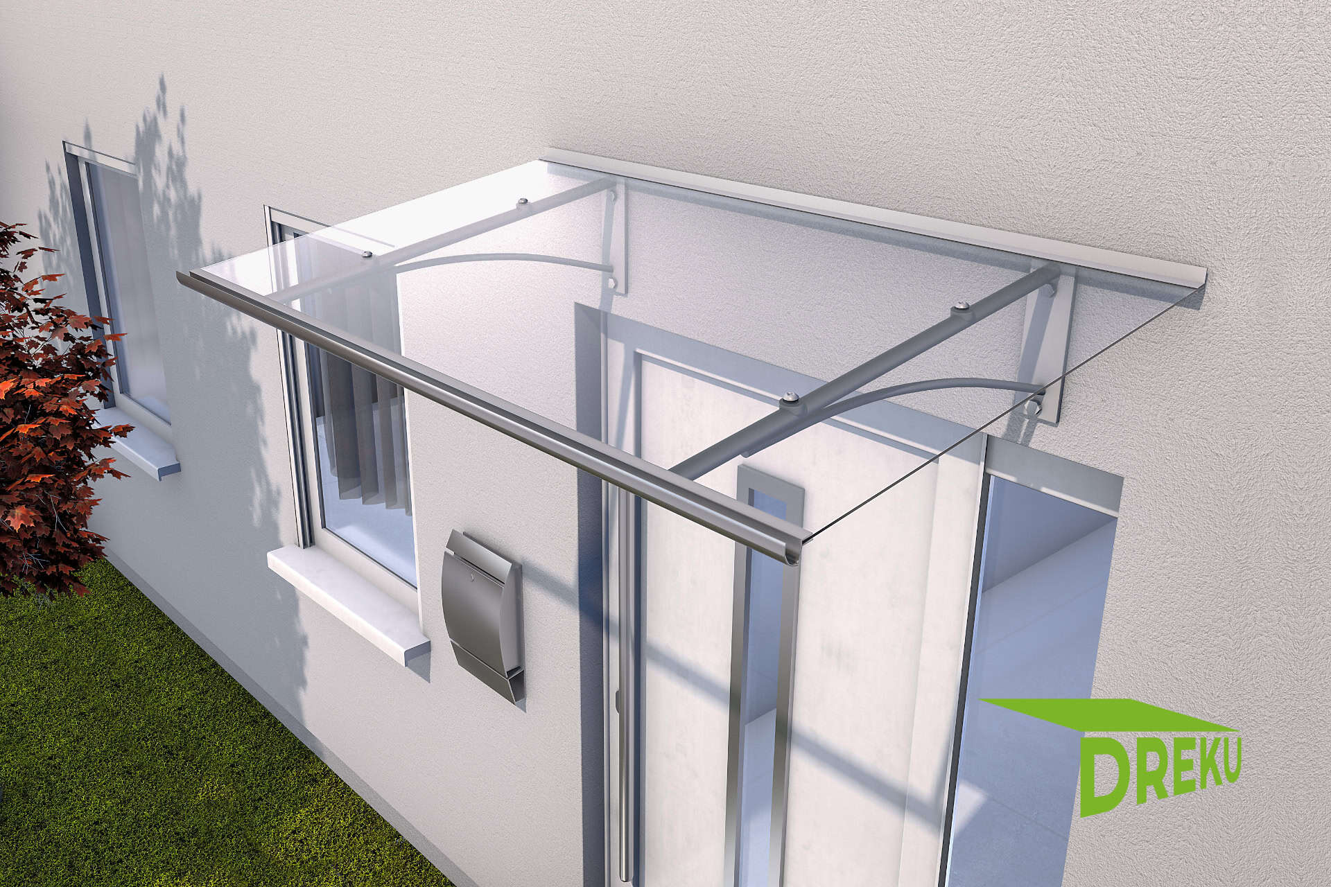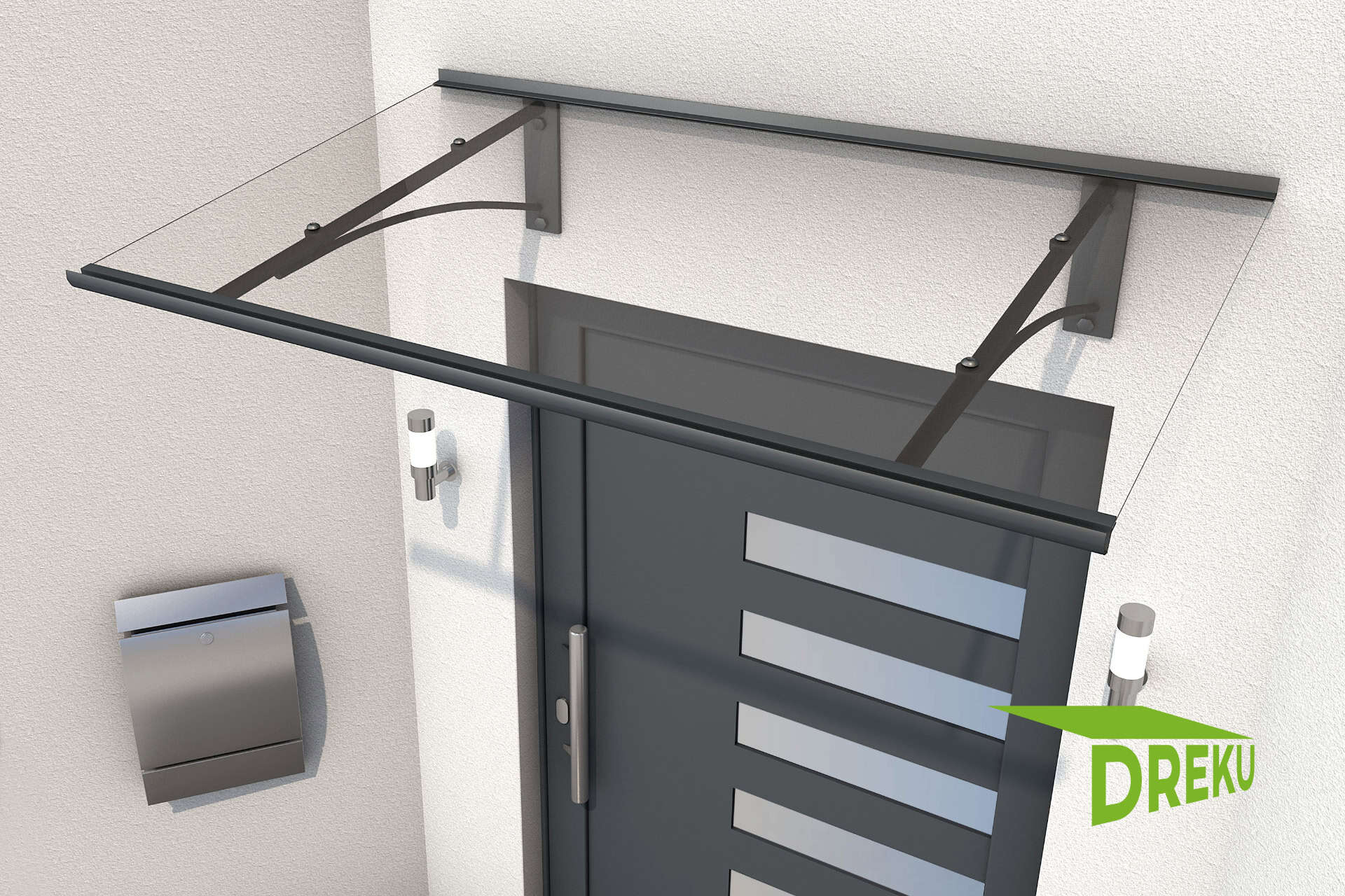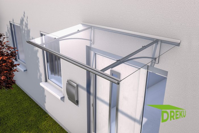 Die Kombination aus pulverbeschichtetem Aluminium und klarem Acrylglas verleiht dem Pultvordach Neumünster eine sehr hohe Haltbarkeit und edle Optik.