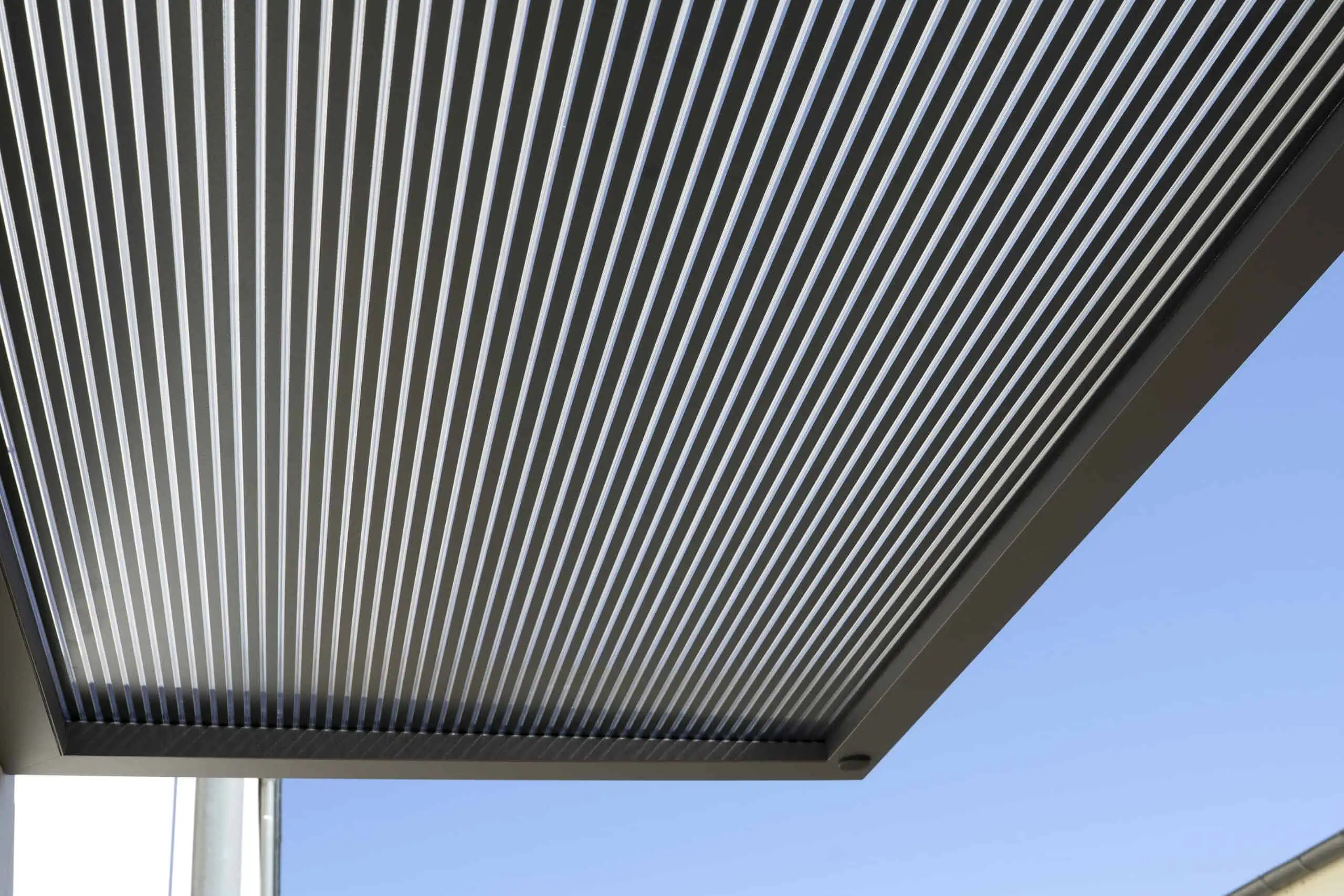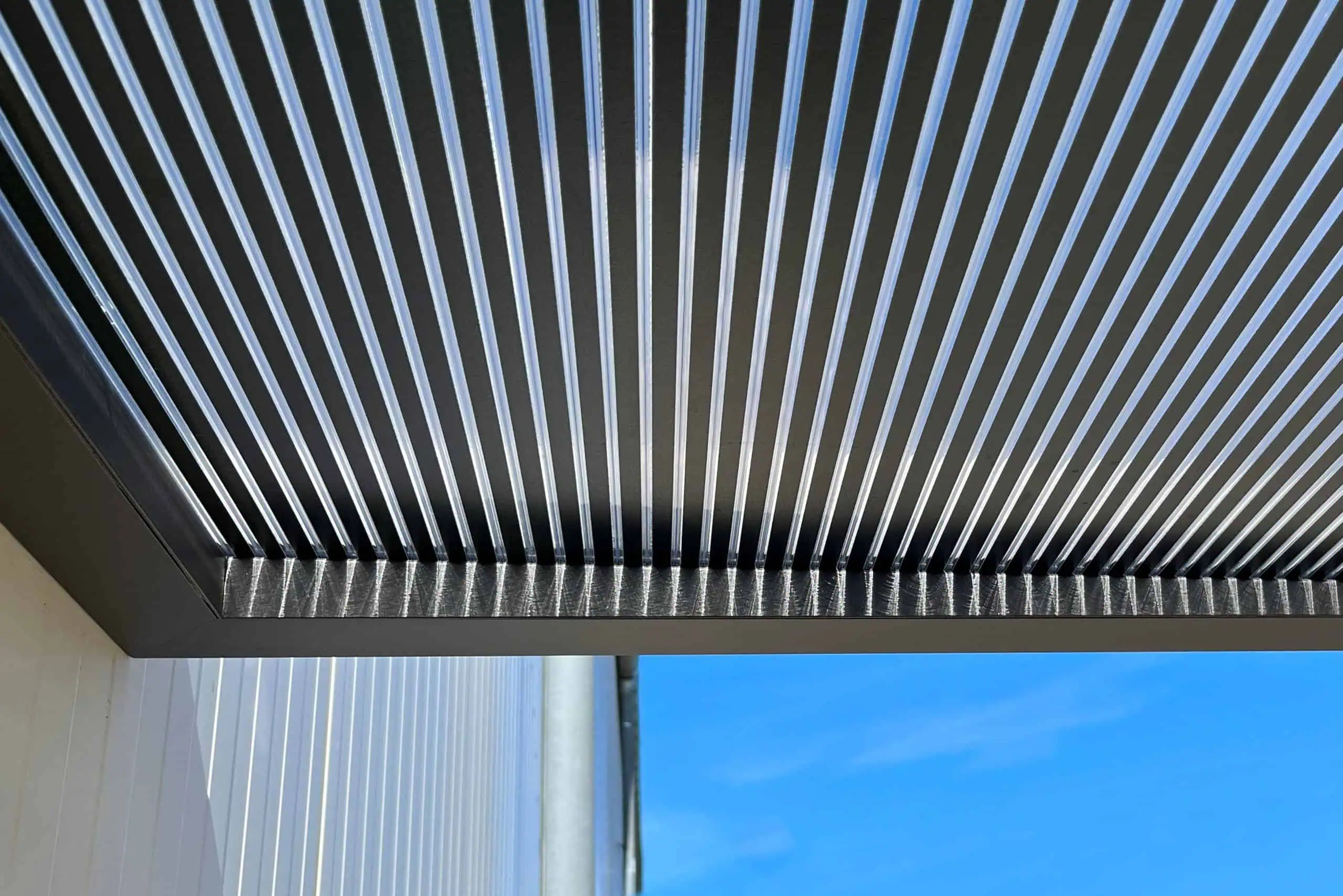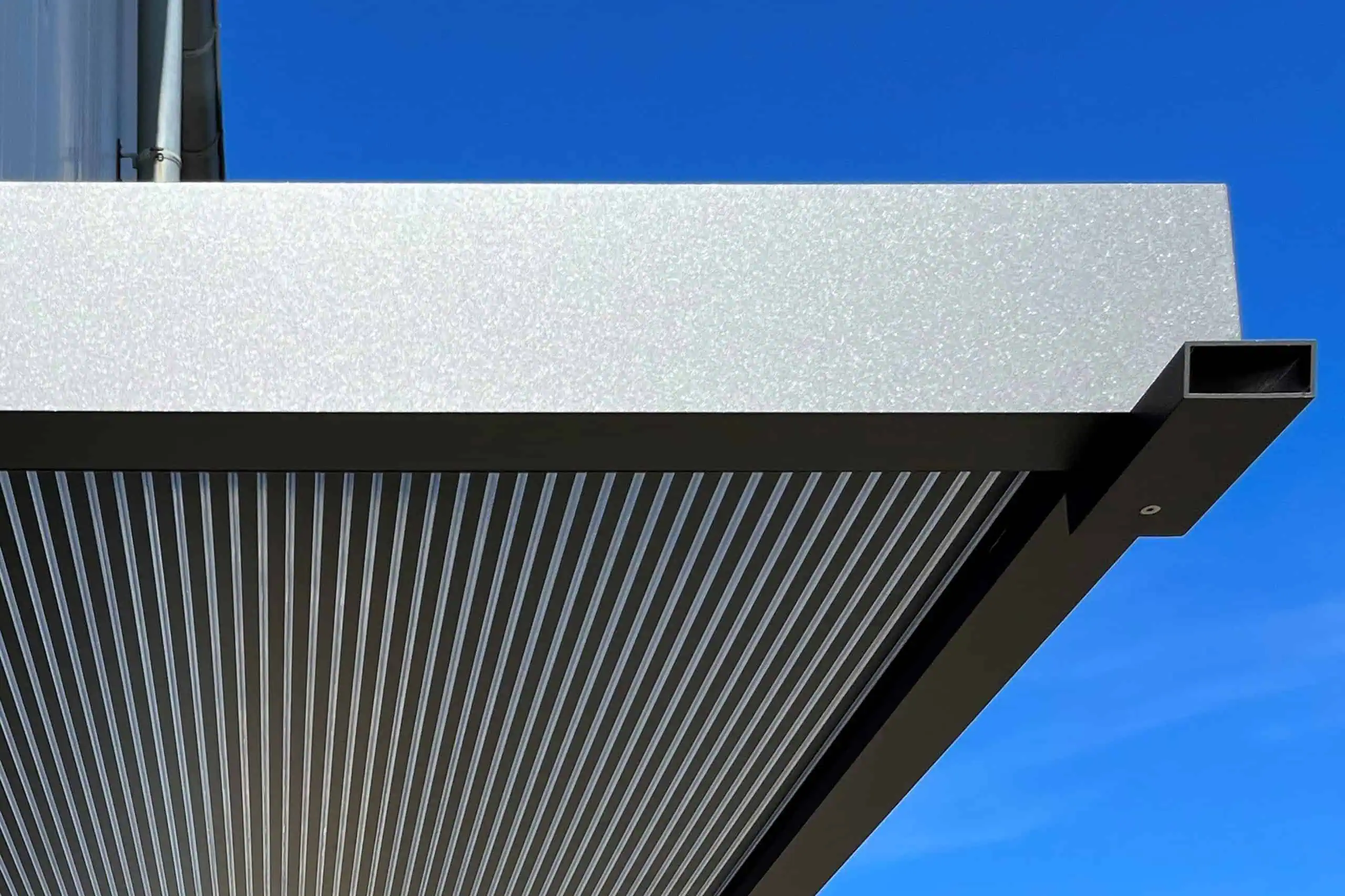 Das neue Vordach verfügt über ein schlichtes kubisches Design aus einer langlebigen Aluminium-Konstruktion, die mit einer Pulverbeschichtung mit matter Feinstruktur versehen ist. Die besondere Raffinesse besteht in der Abdeckung, bei der eine 16 mm starke „Zebraplatte“ zum Einsatz kommt. Die klare Polycarbonat-Stegplatte verfügt über dunkle Längsstreifen, die einen außergewöhnlichen 3D-Effekt kreieren. Sie hält Wind und Wetter zuverlässig fern und kann an heißen Tagen sogar wohltuenden Schatten spenden, wobei sie weiterhin ausreichend Licht hindurchlässt. Eine integrierte Entwässerung verhindert die Ansammlung von Regenwasser.