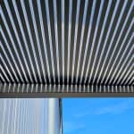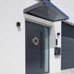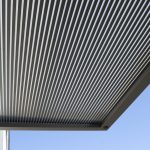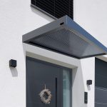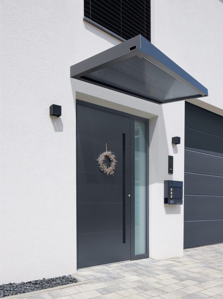 Das neue Vordach verfügt über ein schlichtes kubisches Design aus einer langlebigen Aluminium-Konstruktion, die mit einer Pulverbeschichtung mit matter Feinstruktur versehen ist. Die besondere Raffinesse besteht in der Abdeckung, bei der eine 16 mm starke „Zebraplatte“ zum Einsatz kommt. Die klare Polycarbonat-Stegplatte verfügt über dunkle Längsstreifen, die einen außergewöhnlichen 3D-Effekt kreieren. Sie hält Wind und Wetter zuverlässig fern und kann an heißen Tagen sogar wohltuenden Schatten spenden, wobei sie weiterhin ausreichend Licht hindurchlässt. Eine integrierte Entwässerung verhindert die Ansammlung von Regenwasser.